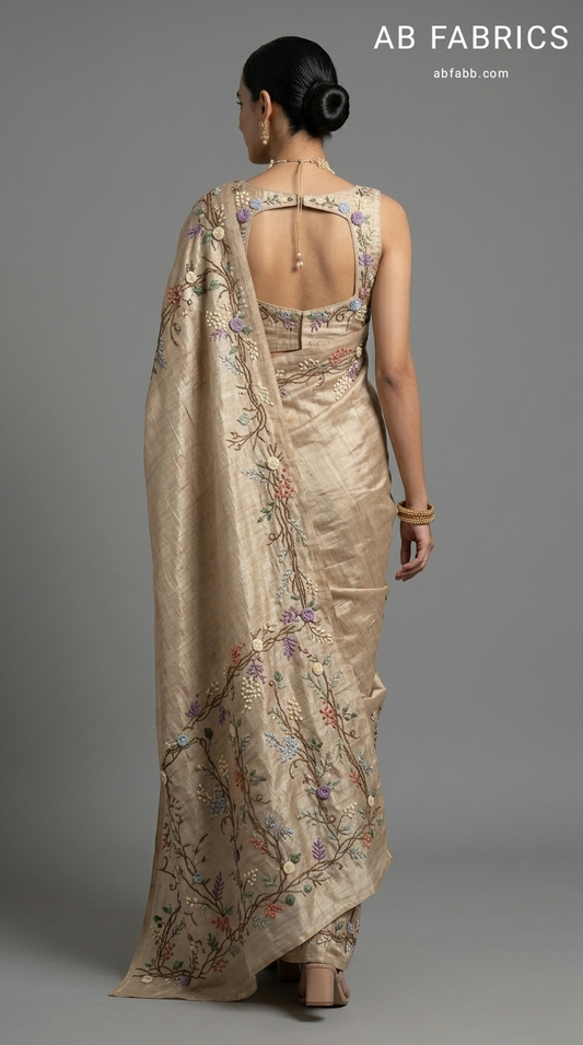 Elegant Soft Beige Hand French Knot Embroidered Silk Linen Saree