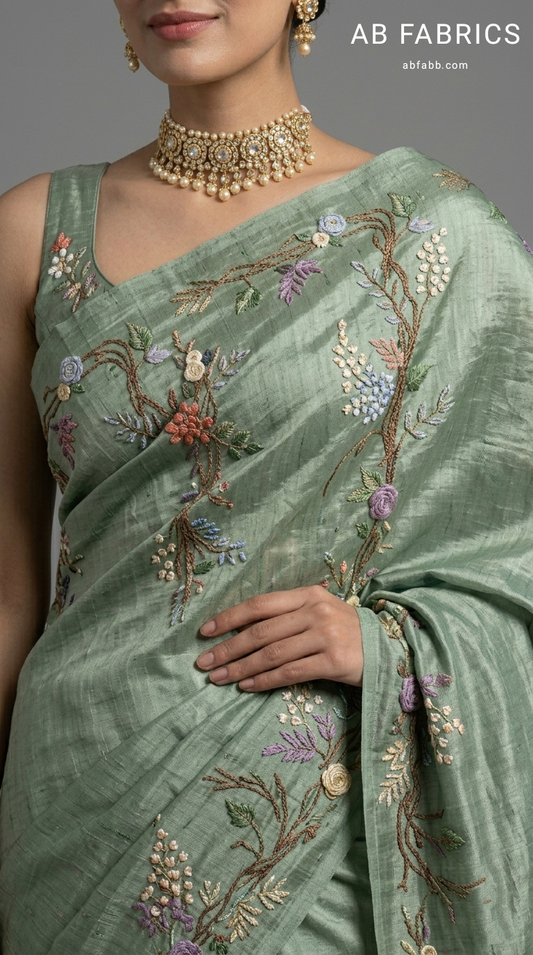 Sage Green Pure Tussar Silk Saree with Hand-Embroidered 3D Blooms