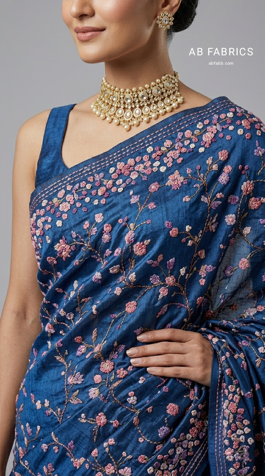 Midnight Navy Pure Tussar Silk Saree with Hand-Embroidered French Knot Blooms
