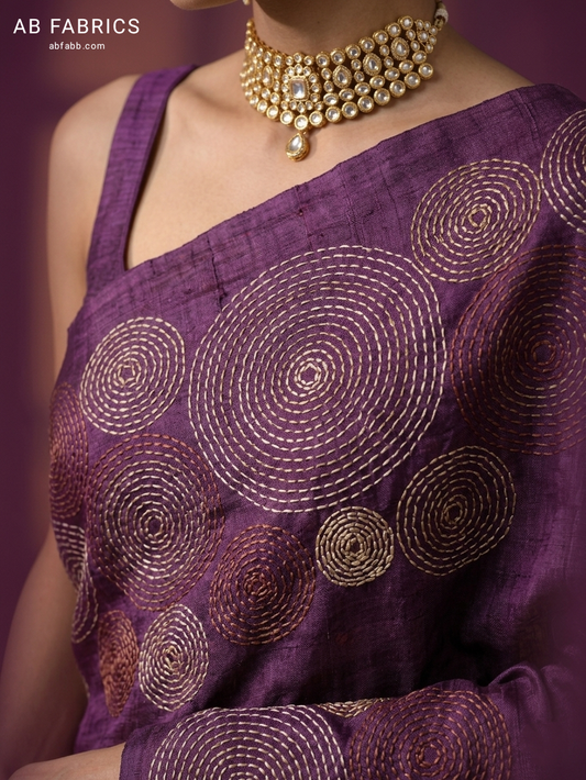 Regal Plum Pure Tussar Silk Saree with Beautiful Hand Kantha Stitch Work