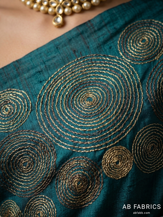 Teal Green Pure Tussar Silk Saree with Beautiful Hand Kantha Stitch Work