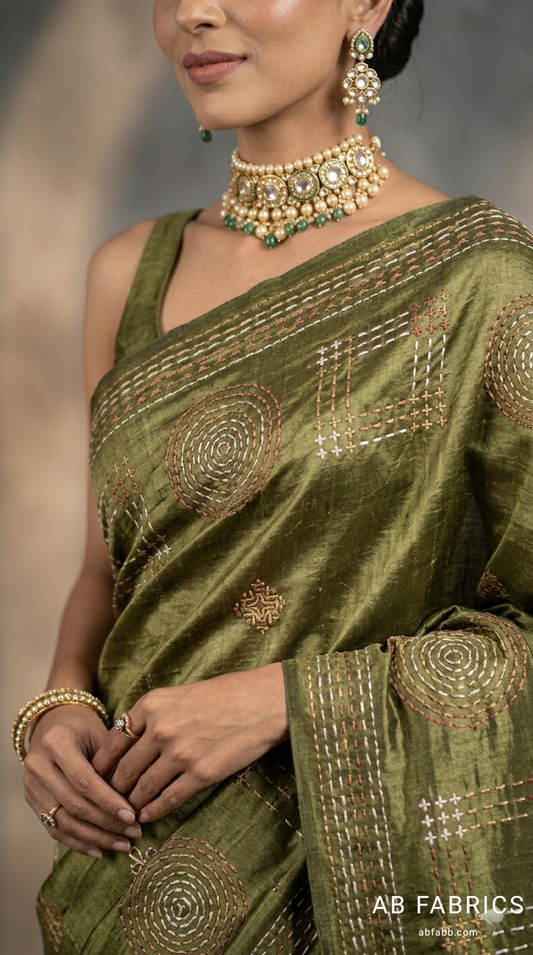 Olive Green Pure Tussar Silk Saree with Beautiful Kantha Stitches Work