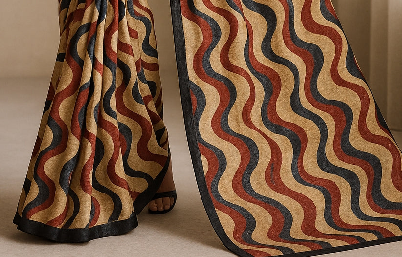 A hand-printed pure tussar silk saree by AB Fabrics is a garment of natural elegance and rich texture. Woven from the silk of wild silkworms, tussar silk is known for its characteristic golden hue and subtle sheen. The fabric is lightweight, breathable, and has a comfortable, airy feel, making it suitable for various climates.