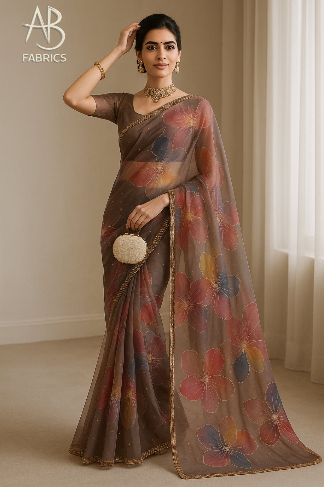 Hand-Painted Floral Organza Saree with Delicate Hand-Work Border OPD08