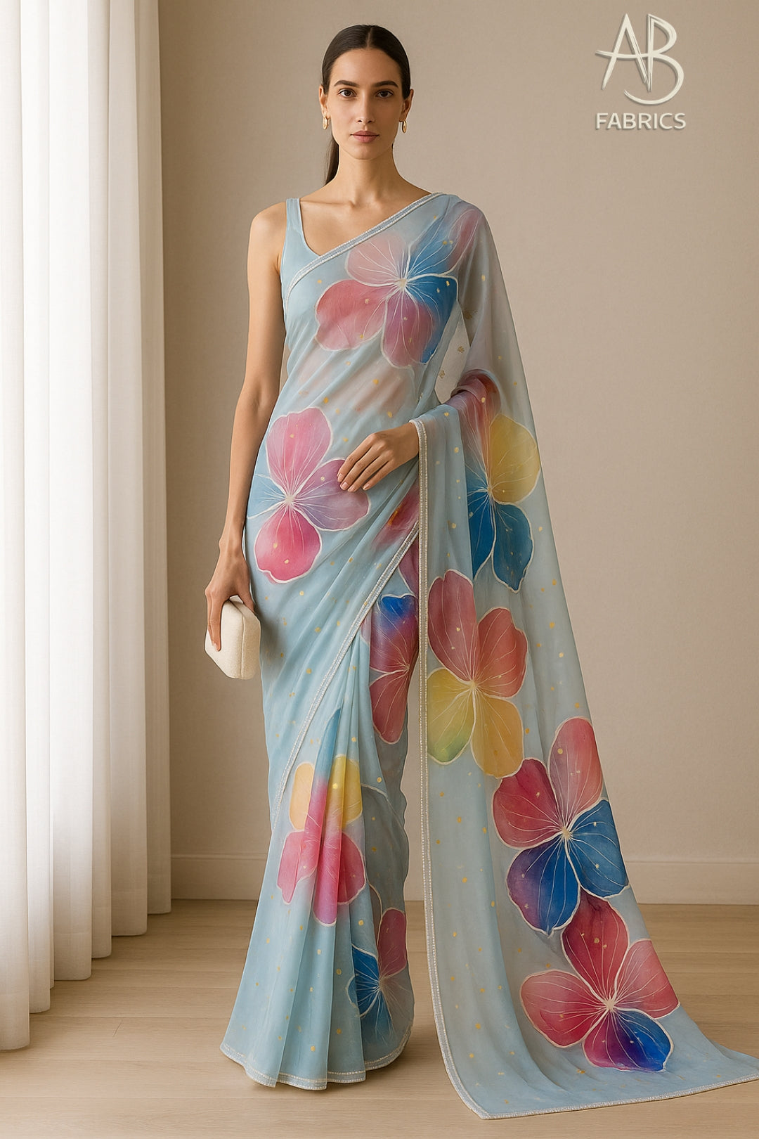 This exquisite saree is crafted from sheer, lightweight organza fabric in a serene. It is adorned with vibrant, hand-painted floral motifs in a beautiful spectrum of pastel colors, creating a soft and artistic appeal. The borders feature a delicate gold-toned hand work, adding a subtle touch of elegance and enhancing the overall drape. This piece is perfect for special occasions, offering a blend of traditional artistry and contemporary style