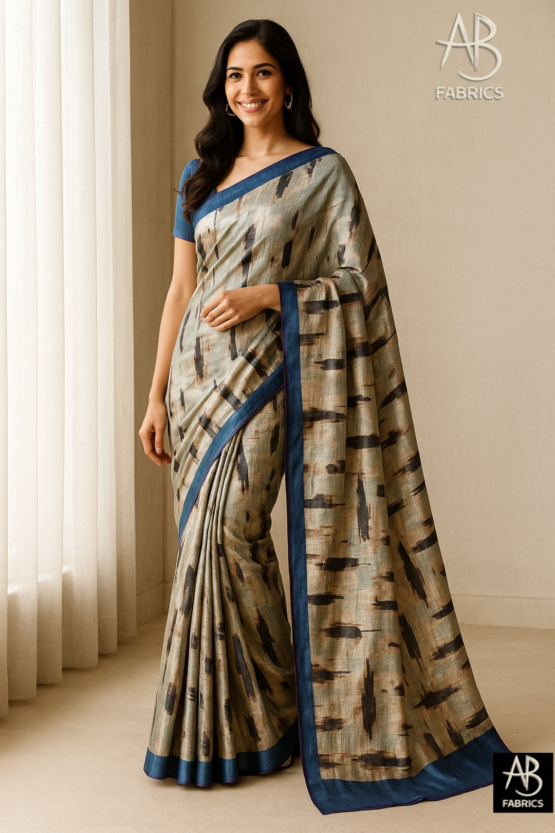 A hand-printed pure tussar silk saree by AB Fabrics is a garment of natural elegance and rich texture. Woven from the silk of wild silkworms, tussar silk is known for its characteristic golden hue and subtle sheen. The fabric is lightweight, breathable, and has a comfortable, airy feel, making it suitable for various climates.
