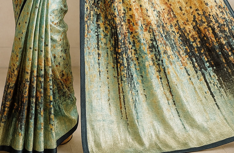 A hand-printed pure tussar silk saree by AB Fabrics is a garment of natural elegance and rich texture. Woven from the silk of wild silkworms, tussar silk is known for its characteristic golden hue and subtle sheen. The fabric is lightweight, breathable, and has a comfortable, airy feel, making it suitable for various climates.